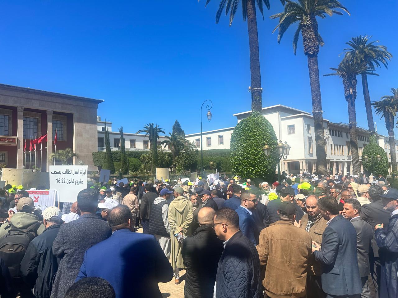 احتج المئات من العدول، اليوم، أمام مقر البرلمان بالعاصمة الرباط، في وقفة وطنية عبّروا من خلالها عن رفضهم لمضامين مشروع القانون رقم 16.22 المنظم لمهنتهم، في خطوة تعكس تصاعد التوتر داخل الأوساط المهنية.